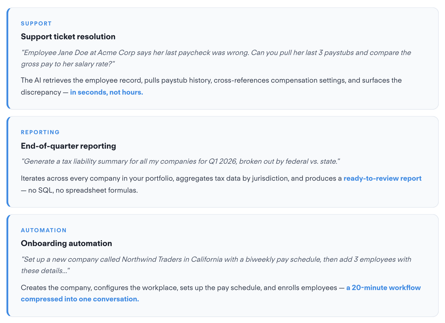 - Company setup & configuration — Manage companies, workplaces, bank accounts, pay schedules, and webhook configurations