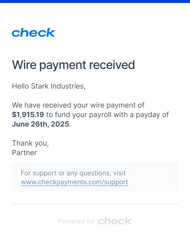 This notification is triggered when Check receives a wire payment to fund a payroll. The Communication includes several key pieces of information.