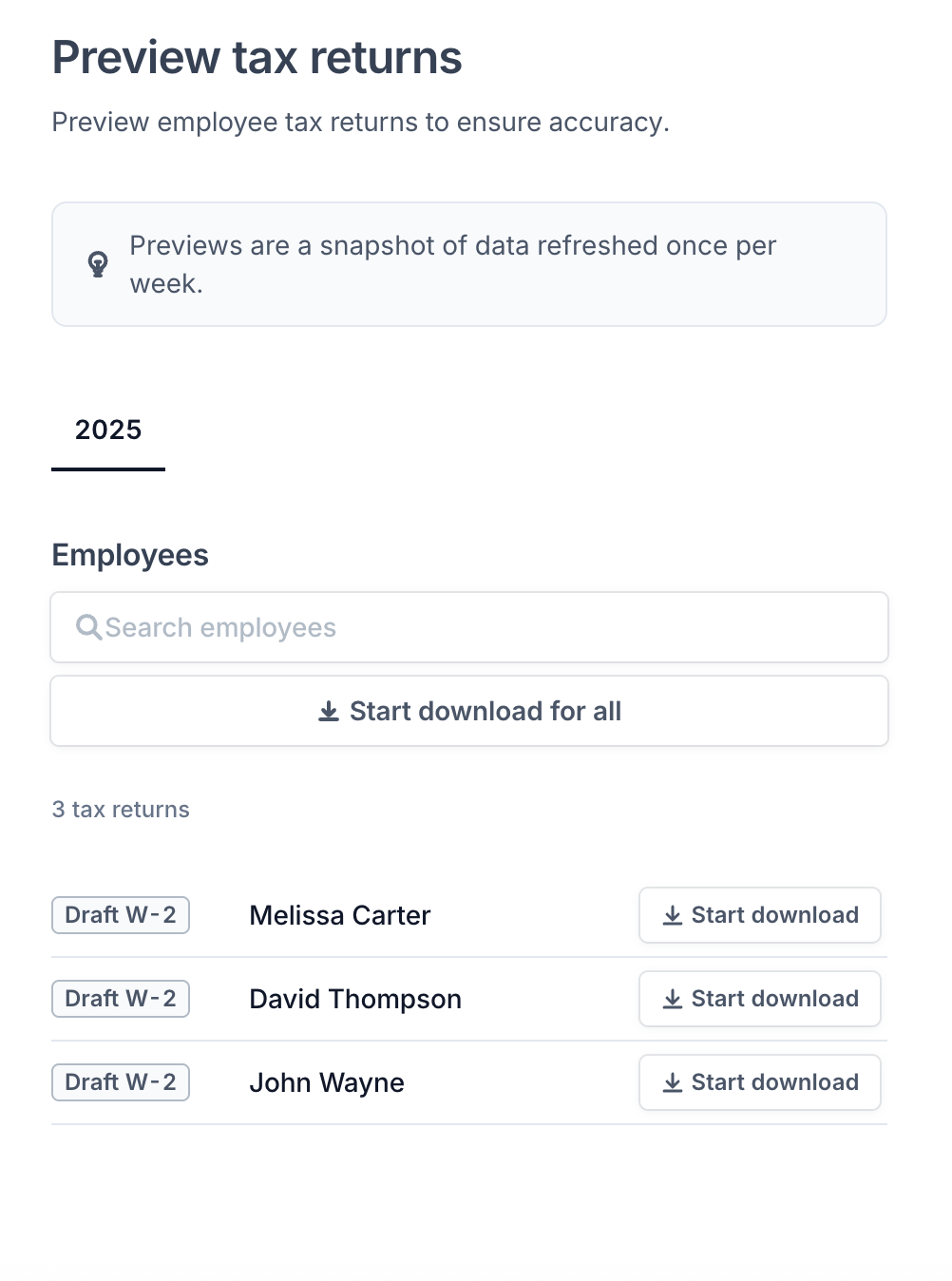 The filing preview component currently enables employers to preview annual employee W-2s and W-2Cs. In the future, it will be expanded to include additional tax return types.